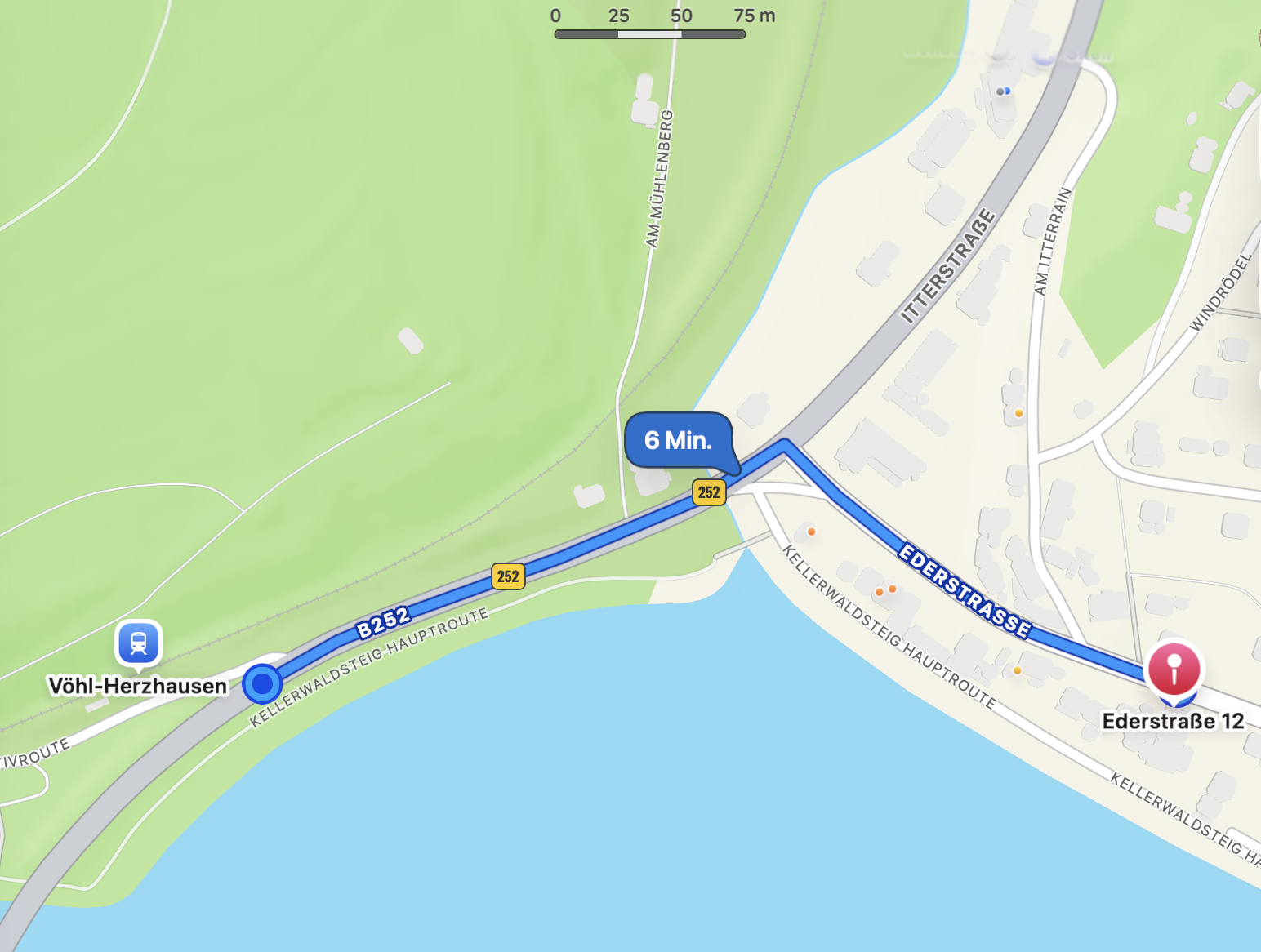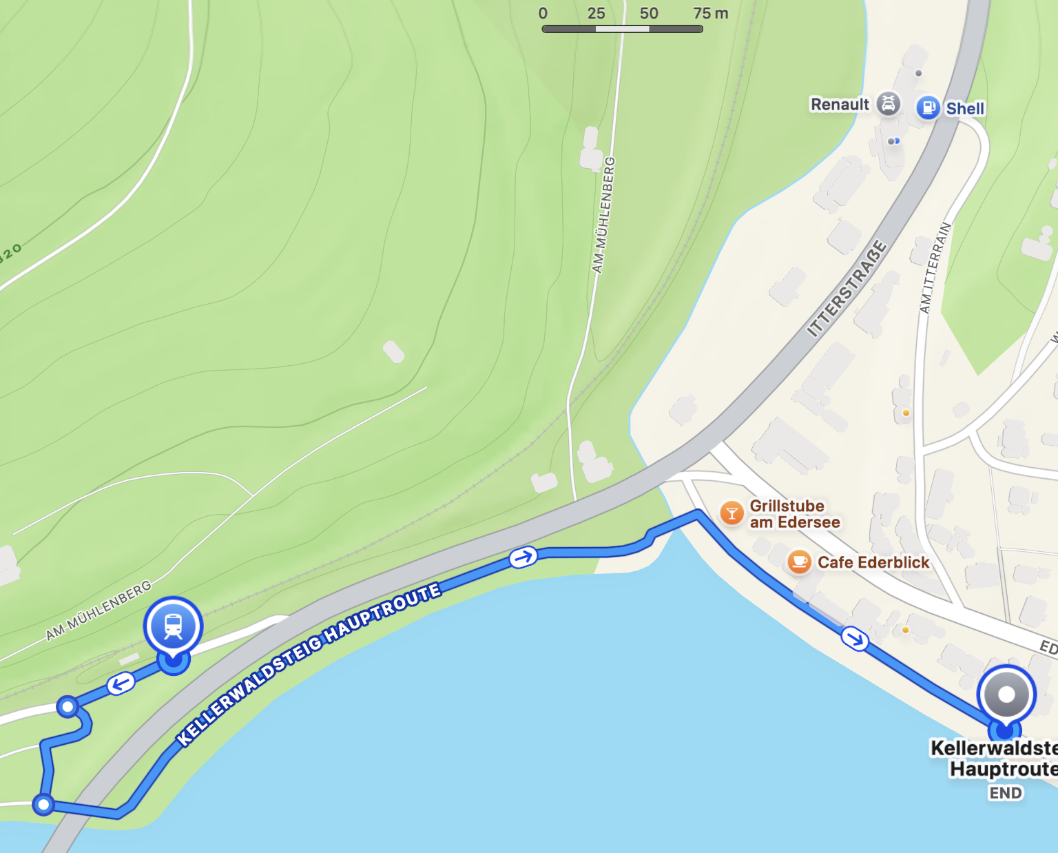 Wenn Du die Straße (mit Auto’s) vermeiden möchtest sind es 100 m. mehr :